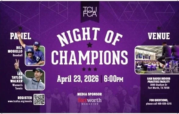 This special fundraiser celebrates all that God is doing through TCU FCA as we build faith, foster character, and inspire leadership among athletes, coaches, and students. Hear powerful testimonies from our staff, student-athletes, and athletic staff, and leave encouraged by how God is moving on campus!